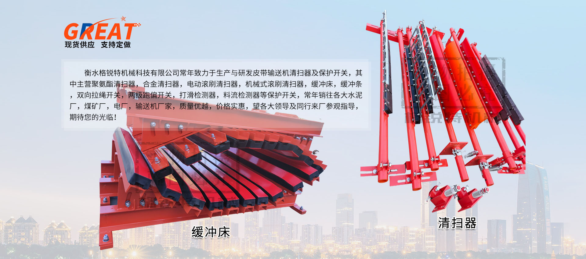 衡水格銳特機(jī)械科技有限公司常年致力于生產(chǎn)與研發(fā)皮帶輸送機(jī)清掃器及保護(hù)開關(guān),其中主營聚氨酯清掃器,合金清掃器,電動滾刷清掃器,機(jī)械式滾刷清掃器,緩沖床,緩沖條,雙向拉繩開關(guān),兩級跑偏開關(guān),打滑檢測器,料流檢測器等保護(hù)開關(guān),常年銷往各大水泥廠,煤礦廠,電廠,輸送機(jī)廠家,質(zhì)量優(yōu)越,價格實惠,望各大領(lǐng)導(dǎo)及同行來廠參觀指導(dǎo),期待您的光臨?。。?/p>